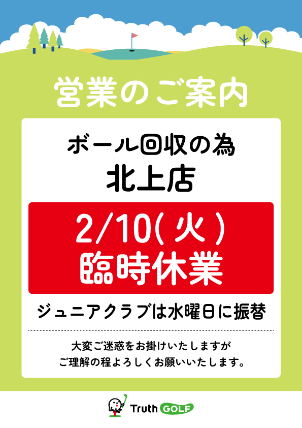 2/10(火)、北上店臨時休業