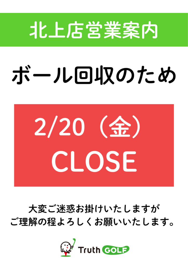 明日2/20(金)はボール回収およびメンテナンス作業のため臨時休業とさせていただきます。